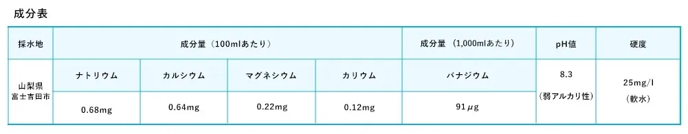 長い年月をかけて自然の力でろ過して磨かれた『富士山の銘水』は、硬度25mg/ℓの軟水です。